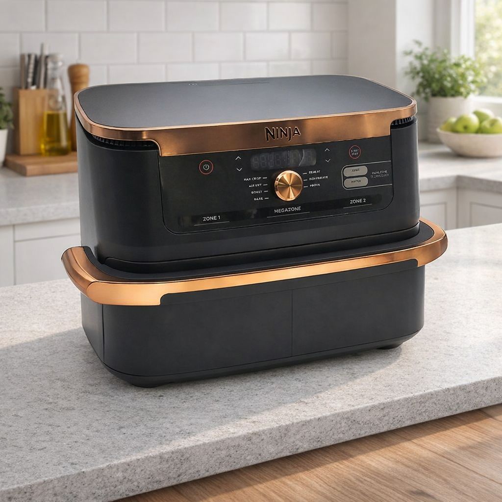 Die Besonderheit der Ninja Foodi FlexDrawer ist ihre Flexibilität. Während herkömmliche Dual-Zone-Fritteusen zwei feste Körbe haben, lässt sich hier die Trennwand entnehmen. So entsteht die sogenannte MegaZone, in der auch große Lebensmittel wie ein ganzer Braten oder ein komplettes Hähnchen problemlos Platz finden. Die Heißluftfritteuse arbeitet deutlich energieeffizienter als ein klassischer Backofen und benötigt kaum zusätzliches Fett.